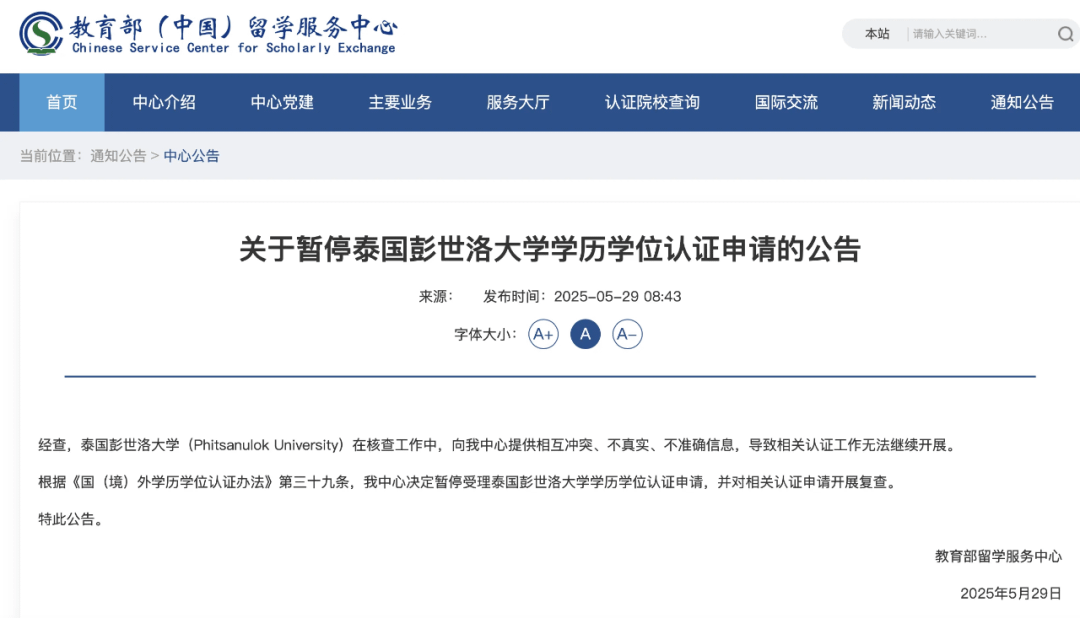5月29日,教育部(中国)留学服务中心发布《关于暂停泰国彭世洛大学学历 学位认证申请的公告》, 经查,泰国彭世洛大学(Phitsanulok University)在核查工作中,向该中心提供相互冲突、不真实、不准确信息,导致相关认证工作无法继续开展。